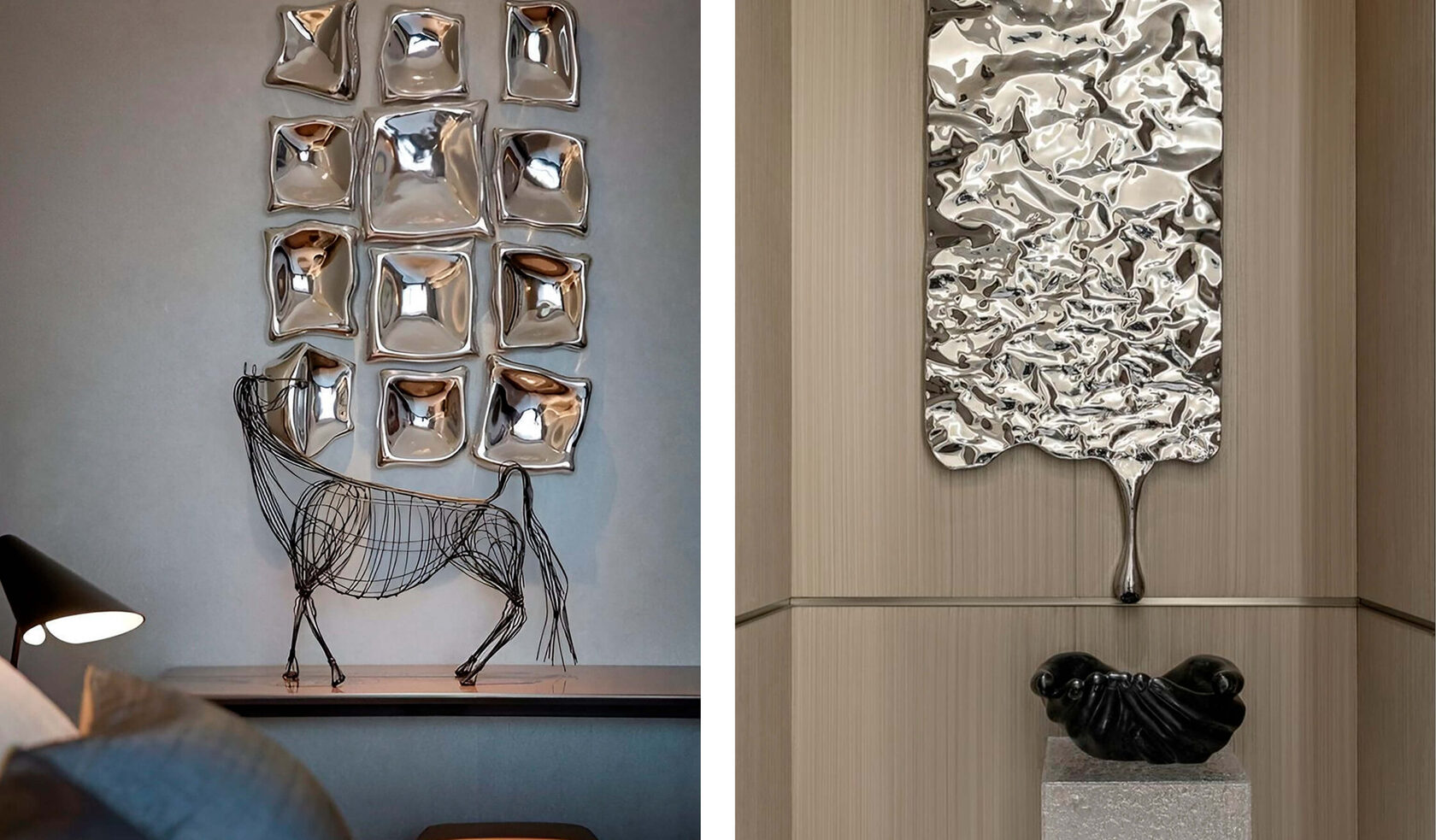 Металл в интерьере действительно сейчас на пике популярности. Мы любим этот приём и используем в своих проектах. Это тренд не новый, а заданный в прошлом году, просто сейчас он становится ещё шире. Учитывая, что основная цветовая гамма, определяющая дух времени, достаточно тёплая и насыщенная, то металлы выступают как некий охладитель. Он может быть и глянцевым, может быть и брашированным (с нанесением крупных или мелких однонаправленных царапин-рисок. — GALA). Ну то есть мы как бы идём по контрасту: в тёплое по цвету помещение выбираем свежие металлические акценты, холодное помещение, наоборот, тёплые — бронзу, латунь, медь. Металл действительно в тренде, его может быть и много, может быть и мало — всё зависит от интерьера.